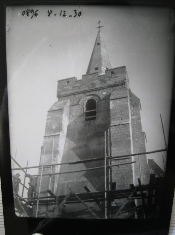 Travaux de restauration du clocher suite aux dégradations de la  Seconde Guerre mondiale