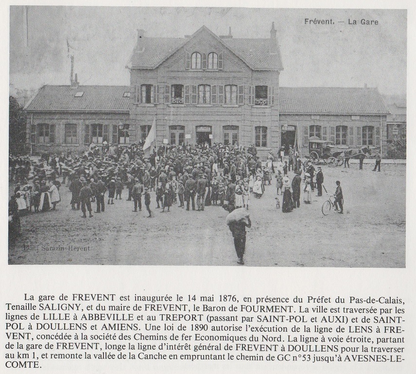 Dans ce contexte, la première gare de Frévent est inaugurée en 1876. La ville compte alors près de 5000 habitants et la filature de lin de ROLLEPOT, la filature de laine de Cercamp et les constructeurs de machines agricoles WINTENBERGER et PRUVOST-LECAS font la prospérité de la ville. Frévent est traversée par la ligne de chemin de fer reliant Lille à Abbeville et au Tréport et la ligne reliant Saint-Pol-sur-Ternoise à Doullens et Amiens.