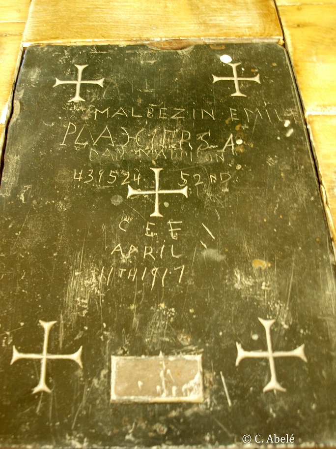 Sur l’autel se situe une pierre noire gravée. Il s’agit d’une inscription faite par un soldat canadien pendant la Première Guerre mondiale, mentionnant son nom, son matricule, sa ville d’origine et la date d’inscription. Une croix en grès du 17e est également présente à proximité du mur sud de la sacristie de l’église. Celle-ci est inscrite au titre des Monuments Historiques par arrêté du 18 août 1988.